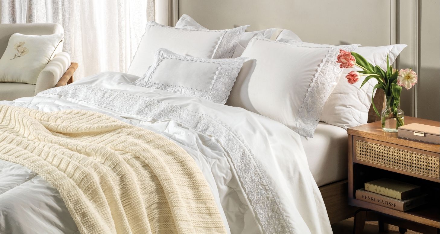 Além da cama, mesa e banho, o branco se adapta facilmente a outros espaços da casa. Almofadas, mantas, cortinas e objetos decorativos ajudam a espalhar a cor de forma sutil e contínua, criando unidade visual entre os ambientes.