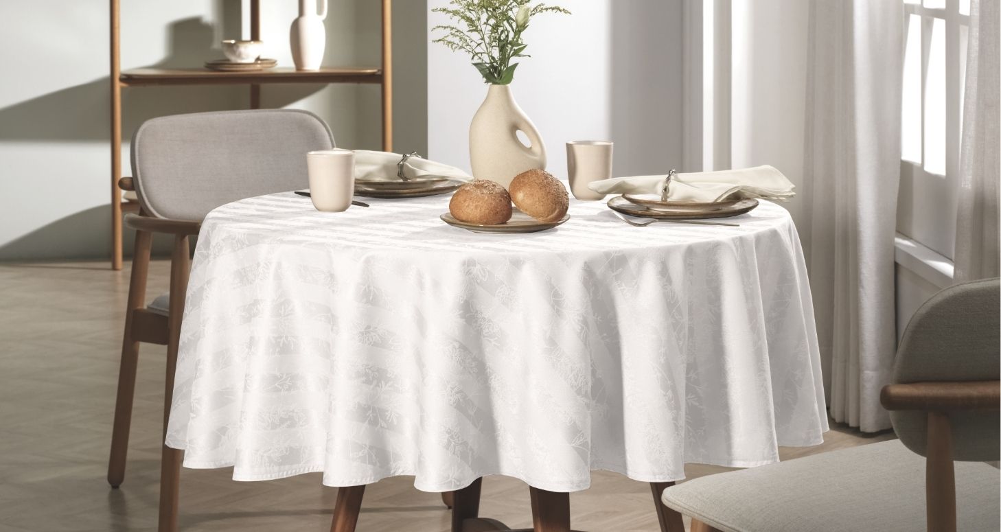 Na mesa, a cor do ano aparece como uma escolha elegante e funcional. Toalhas, guardanapos e caminhos de mesa em tons de branco criam uma base neutra e luminosa, perfeita para valorizar a refeição e os momentos compartilhados.